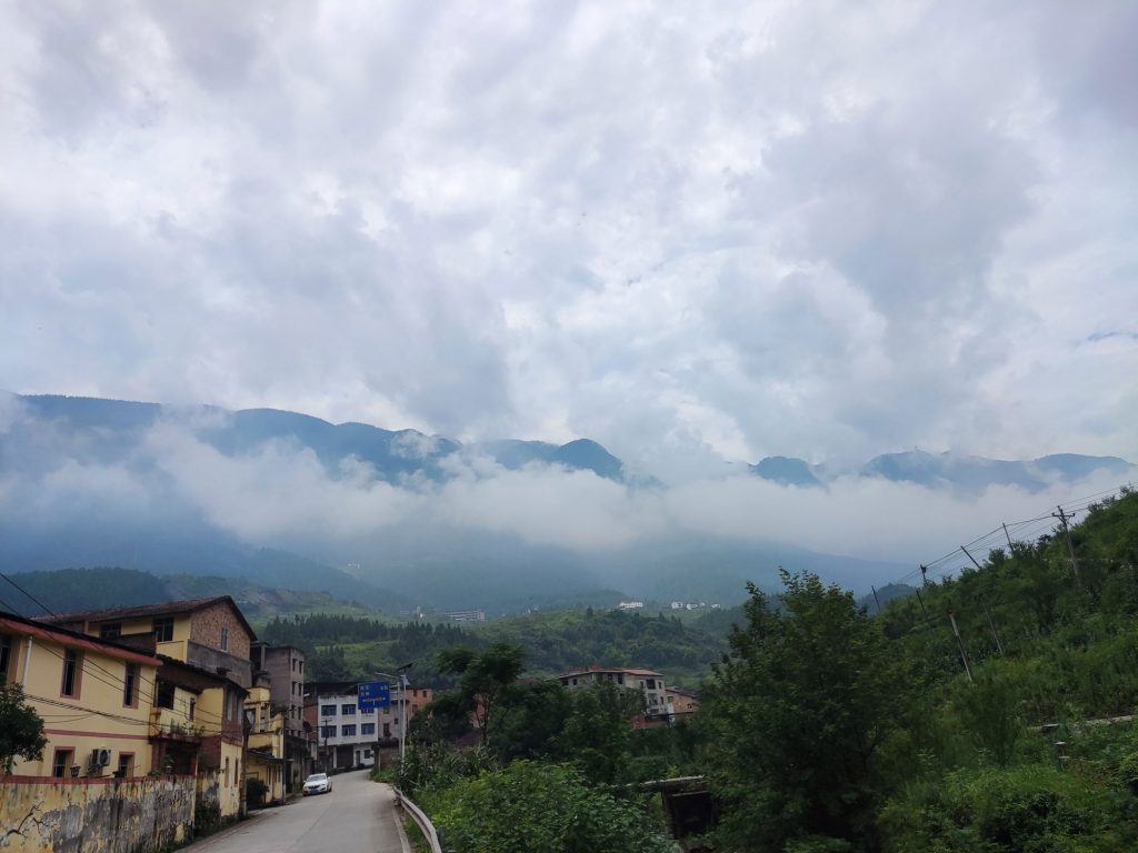 下雨下坡是最不爽的。你不能骑的太快。一是怕打滑出事故,二是水会通过轮子甩你脸上或者背上。感觉不到一丝丝乐趣。貌似上天也知道我的情况,然后开启了大雾模式。好家伙,这下慢的更有理由了。当看到雾气的时候,我也有点不敢走了。可是没办法,你不走的话。这里也留不住你。索性就死马当活马医,要是老天收我,迟早都会收的。我就这样,雨大了找个地方停一会,雨小了再走。中途还想上厕所,遇到个尴尬事。就是被人发现了。我以为那户没有人,就想着方便下。结果裤子都来不及提。