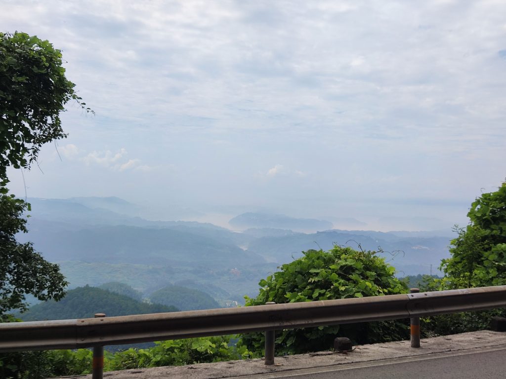 在这个弯我停了很久,中途还有几辆车下来玩的。因为这里有个蜜蜂园。后来我查地图才发现我到这里其实骑行了二十公里左右的上坡路了。真的体力不多,而且这会还非常的热。为了保存体力,每过一个树荫处就停留下。不然自己的身体变得很热。减少水分和体能消耗。还好国道的路,坡度不会很大。我就这样遇到坡推行,遇到平缓的路骑行,遇到树荫就停留的形式过了大约4公里的Z字形上坡。最后一段最坑爹,因为是新修的路,特别难骑,加之把两边的树都砍光了。基本没有树荫,我真的是热的不要不要的。此时从山顶望下去,只能看到长江。除非建筑物很大,不然已经看不到房子了。下面灰蒙蒙的一片黑。我估算这个山顶应该超过一千米往上了。此时还做了一首诗: